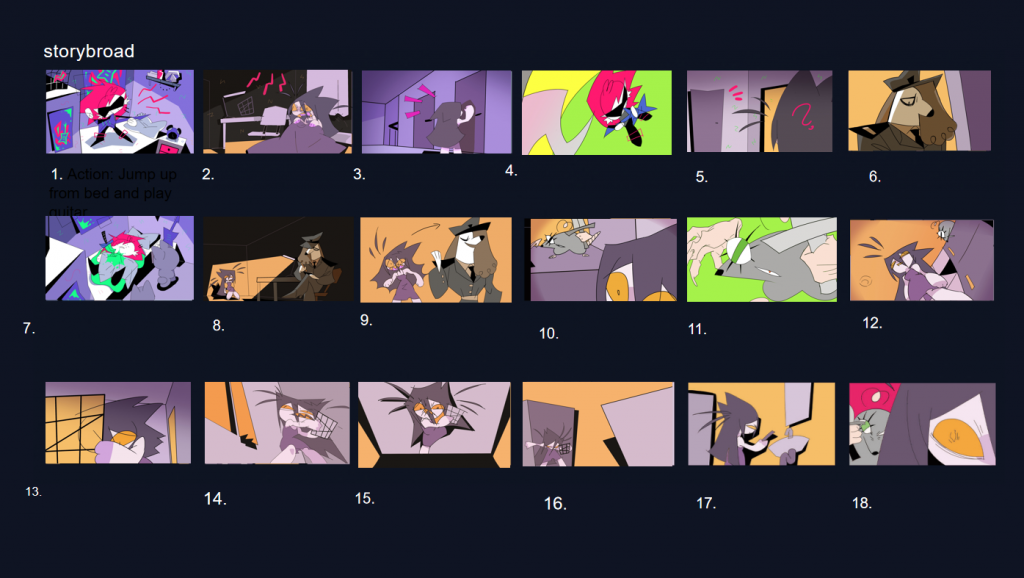 Storyboard: When creating a storyboard, it is necessary to clearly present the entire story of the animation through shots. The most important aspect is the coloring of the pictures. A well-structured shot with a clear black-and-white contrast and correct color balance can enable the audience to understand the characters’ movements and spatial relationships in this scene. Below the shot, the lines of dialogue for the characters should be written, and a brief description of the characters’ emotions and actions should also be provided.