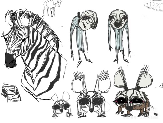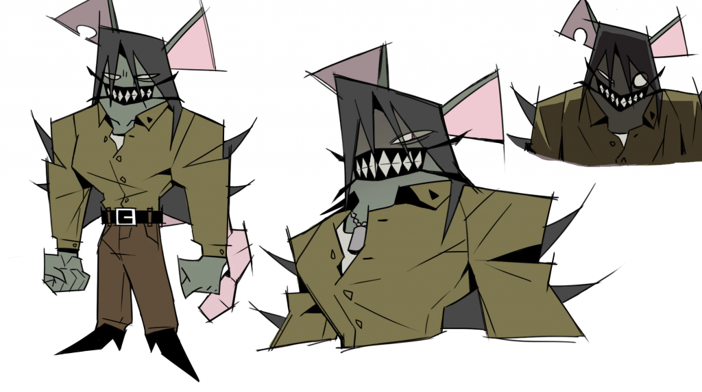 Zebra: This character is an important part of the story plot of my project. He is a murderer and also a zebra with self-awareness disorders. He is wearing the hospital gown of a mental institution. To reflect the self-awareness disorder feature of this character in terms of appearance, I did not design this character’s appearance according to the design features of a zebra. I drew the appearance of this zebra as a caterpillar and hoped that this design would trigger the viewers’ strange feelings and add a sense of mystery to the character. During the design process, I also discovered that adding asymmetrical designs to the character would make him look even stranger. This method can be used to design villain characters. That’s why I added a asymmetrical a asymmetrical arm to this character.