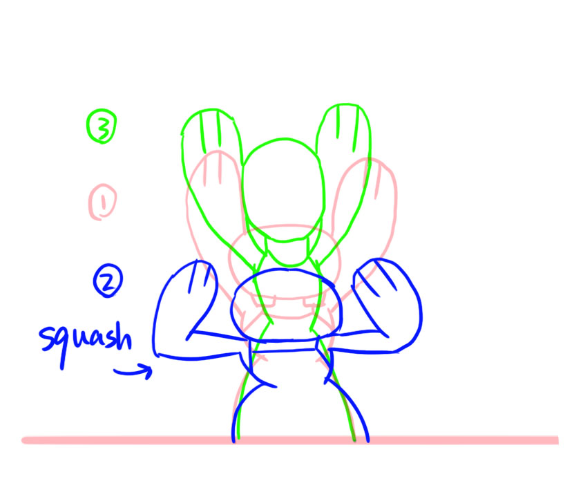 The advantage of this approach is that it allows for a relatively smooth movement with a small number of frames. However, I believe that adding such an action pattern to every movement would make the character’s movements too stiff. To further enrich my character movements, in this CSM practice on the principles of character animation, my goal is to learn how to draw more refined movements (character facial expressions and action details) and make the character movements closer to the natural movement laws. I tried removing the squash frame and making the character’s movements more exaggerated. I realized that designing keyframes in this way would make the movements more natural